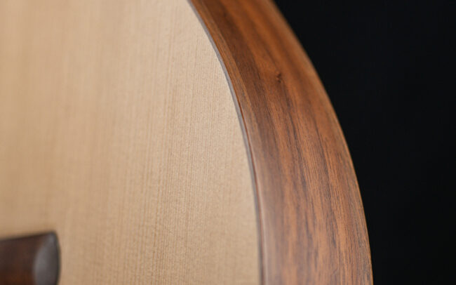 Tous les bois utilisés pour cette guitare, du moindre bois utilisé pour le barrage de table d’harmonie ou du fond, pour les filets ou les contre-éclisses, jusqu’à la table, le manche, le fond et les éclisses sont des essences locales ou cultivées en France.