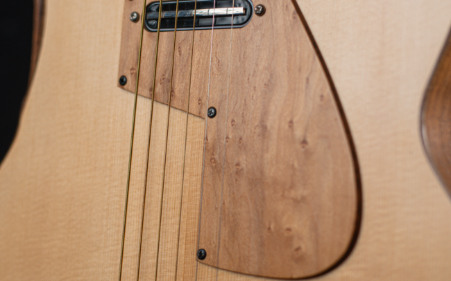 La structure en bois de la partie centrale : C’est la pièce de base qui supporte les micros, et sur laquelle est vissé le manche. Elle a été étudiée pour apporter de la richesse harmonique, pour ajouter du « sustain » et limiter le « larsen ».