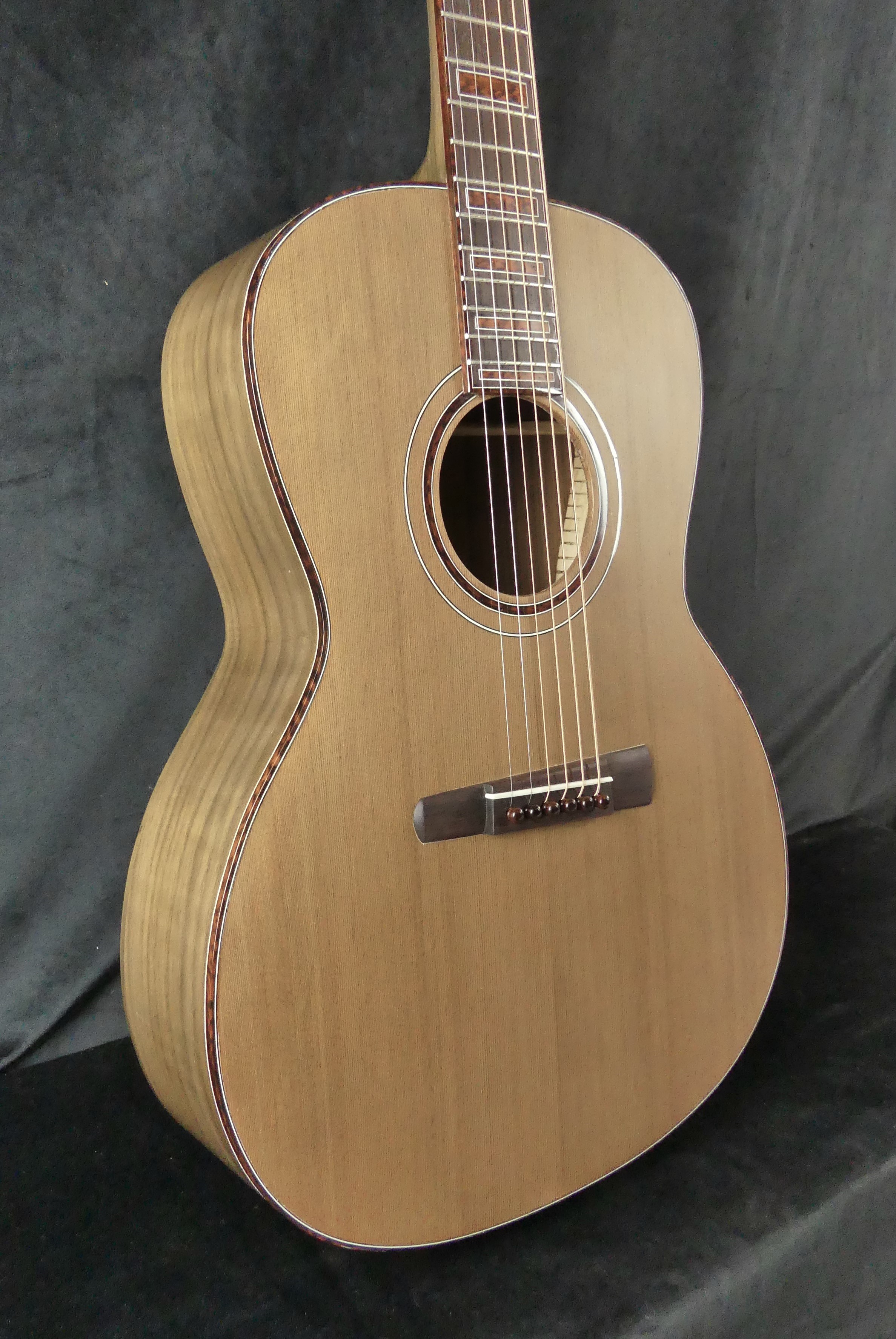 Fileterie, rosace & repères Amourette vernis brillant / Table Red Cedar et Dos & éclisses Noyer, aspect vieilli « bois flotté » vernis mat / Logo de l’artiste sur la tête en nacre noire & Logo Luthier au dos du talon